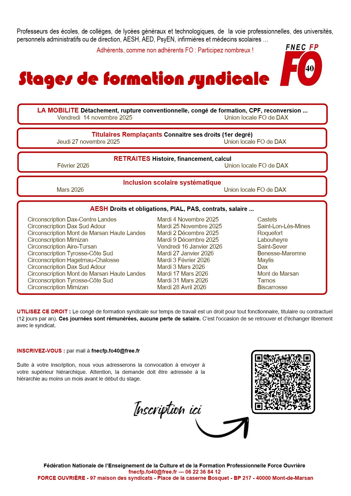 Nous, professeurs des écoles des Landes présents au stage « Mobilité » organisé par la FNEC FP FO des Landes le 14 novembre 2025 à Dax, constatons que 5 stagiaires n’ont pas pu participer au stage faute d’être remplacés, la DSDEN leur accordant le stage « sous réserve de l’accueil des élèves ». Chacun devrait alors, soit répartir ses élèves dans les autres classes et faire supporter l’absence par les autres collègues, soit rester en classe.