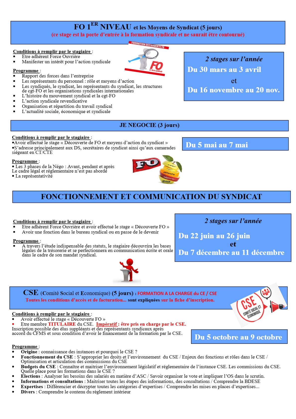 Le congé de formation syndicale, sur temps de travail, est un droit pour tout fonctionnaire : « L'agent public en activité a droit à un congé pour formation syndicale avec traitement d'une durée maximale de douze jours ouvrables par an » (Code général de la fonction publique : Section 1 : Congé pour formation syndicale. Article L215-1.)