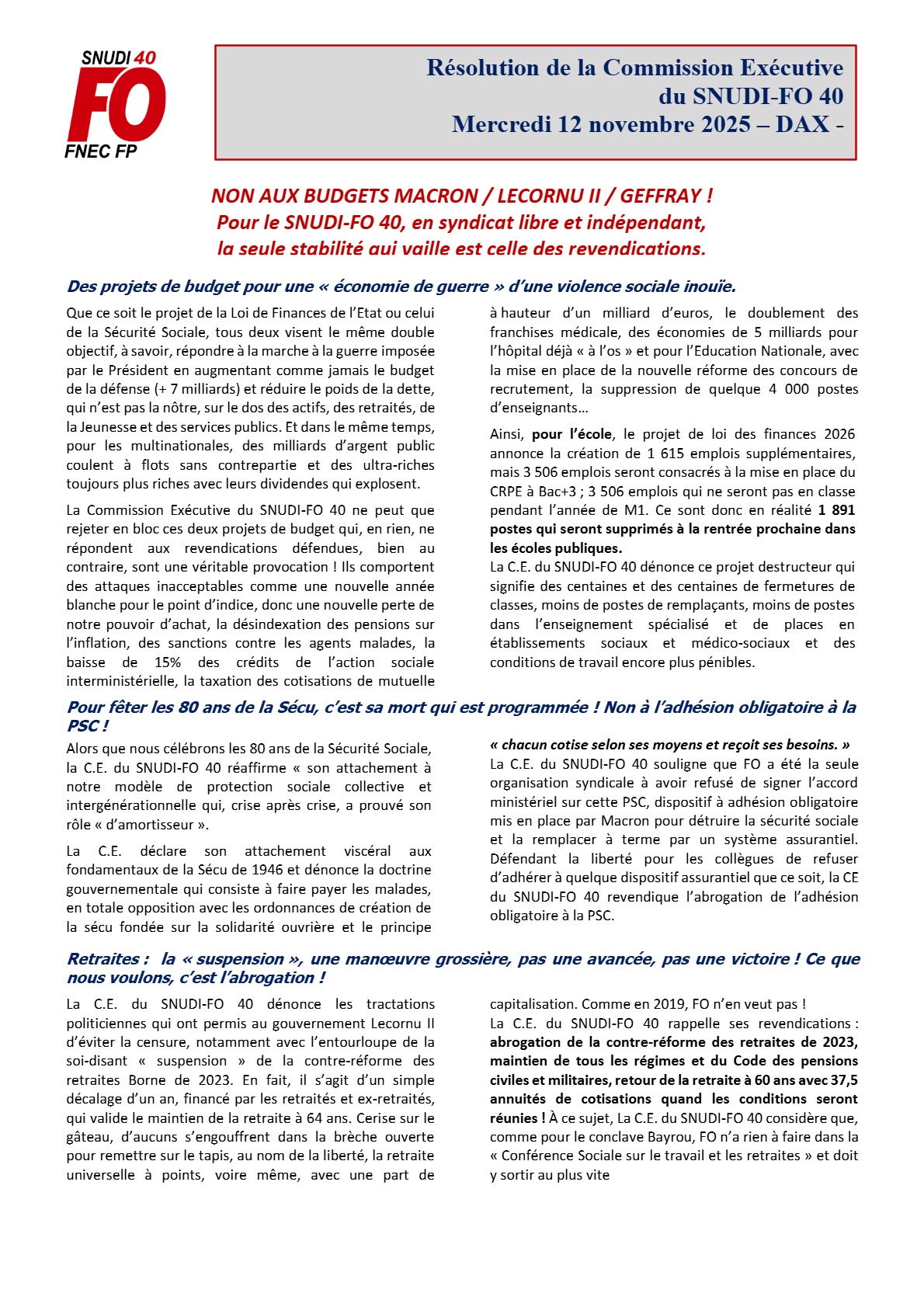 Nous, professeurs des écoles des Landes présents au stage « Mobilité » organisé par la FNEC FP FO des Landes le 14 novembre 2025 à Dax, constatons que 5 stagiaires n’ont pas pu participer au stage faute d’être remplacés, la DSDEN leur accordant le stage « sous réserve de l’accueil des élèves ». Chacun devrait alors, soit répartir ses élèves dans les autres classes et faire supporter l’absence par les autres collègues, soit rester en classe.