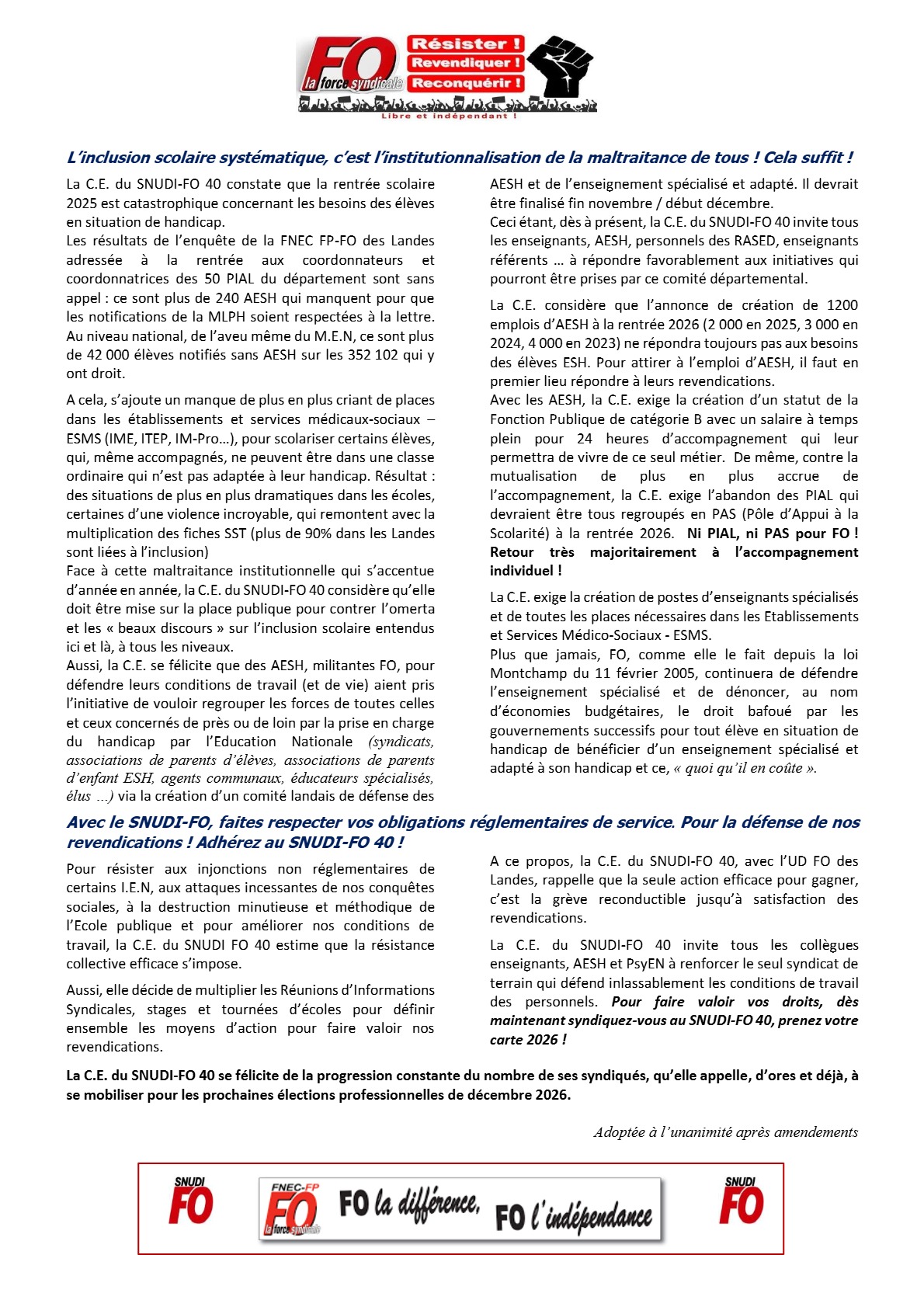 Bienvenue sur le site du SNUDI-FO 40