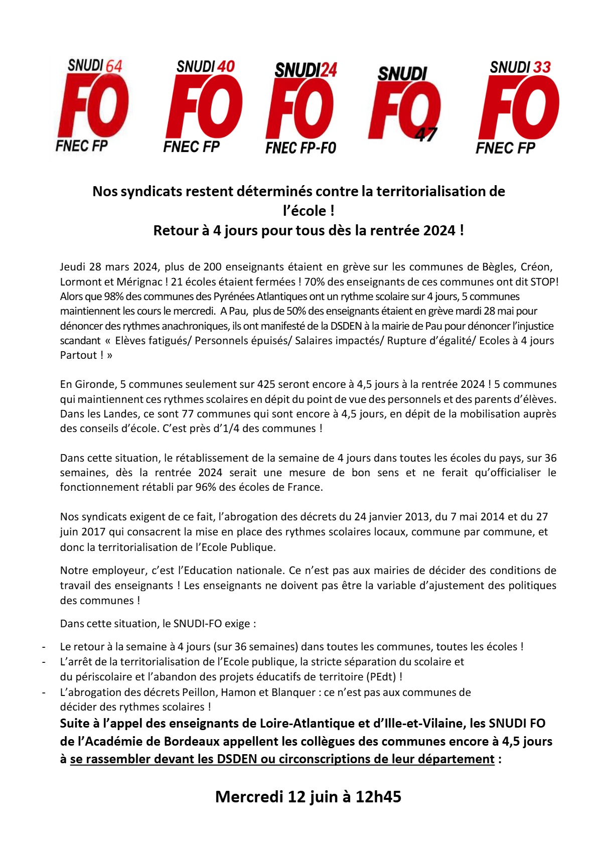(...)Enfin, en ce qui concerne les rythmes scolaires, la FNEC FP FO des Landes ne peut que se féliciter de voir de nouvelles écoles passer à 4 jours. Car, sans avoir amélioré les conditions d’apprentissage et la fatigue des élèves, les 4,5 jours auront dégradé les conditions d’exercice des enseignants (déplacements supplémentaires, pas de coupure dans la semaine, confusion scolaire/périscolaire, territorialisation…). Il est temps pour le Ministre d’unifier à l’échelle nationale une situation dérogatoire...à plus de 90% ! (...)