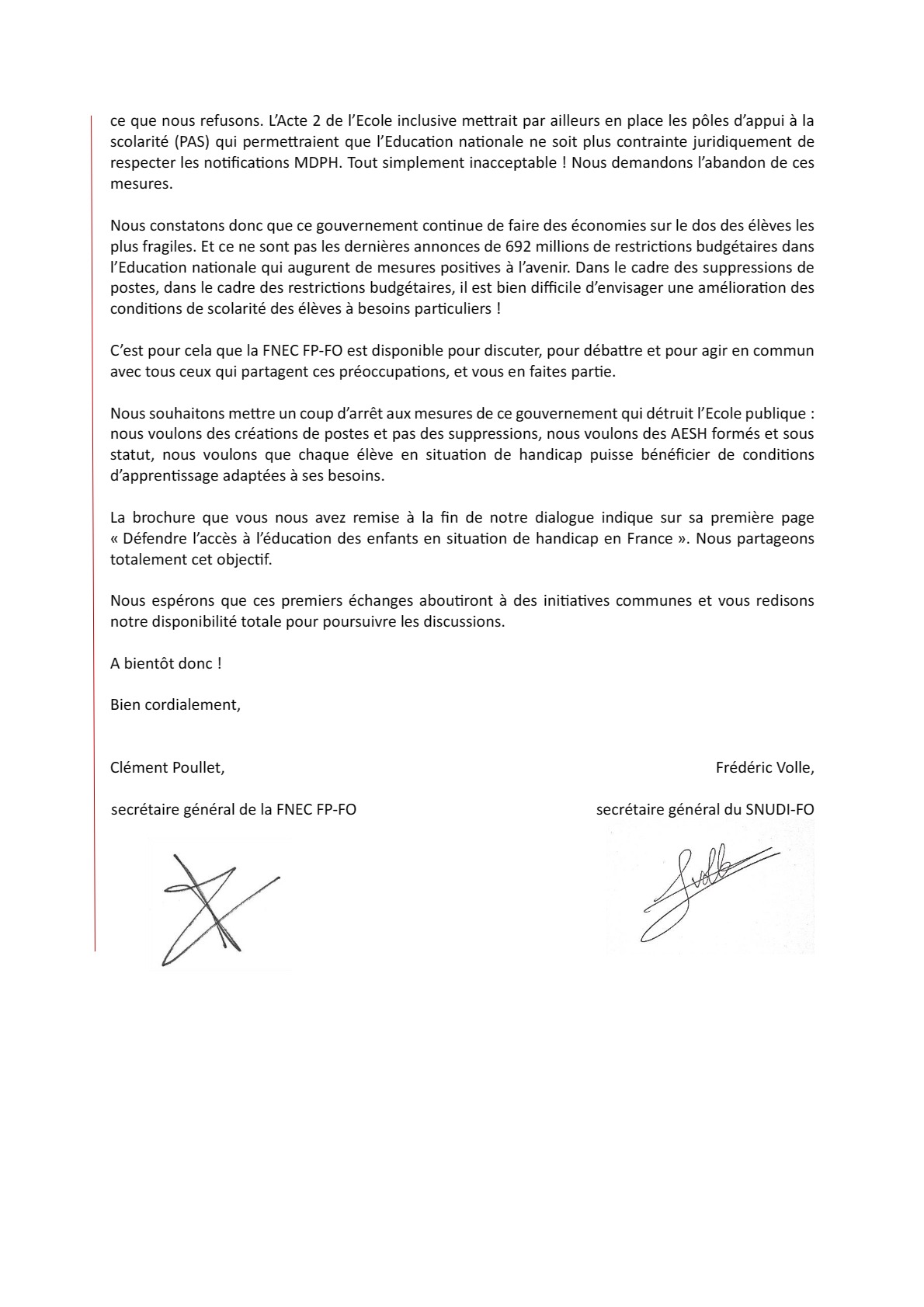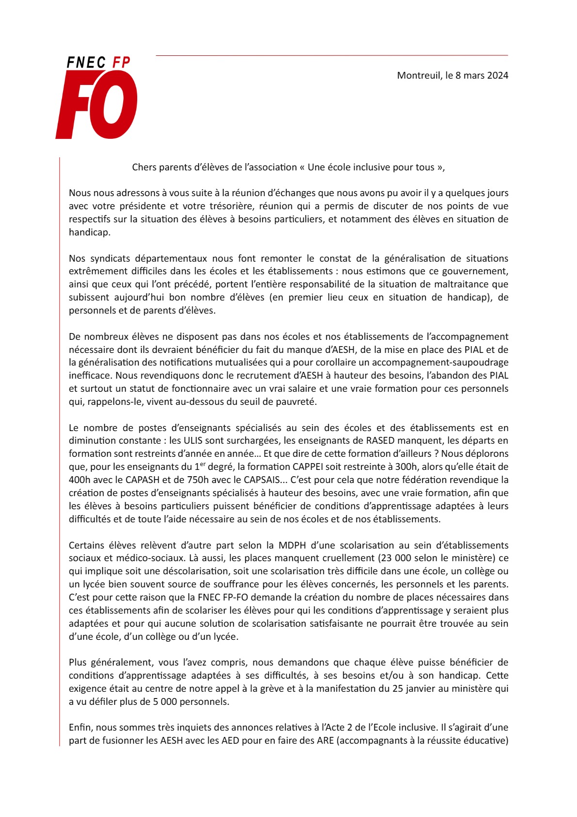 A lire, le courrier adressé à l'association " une école inclusive pour tous " qui fait suite à la rencontre que nous avons eu avec cette association dans nos locaux à Montreuil.