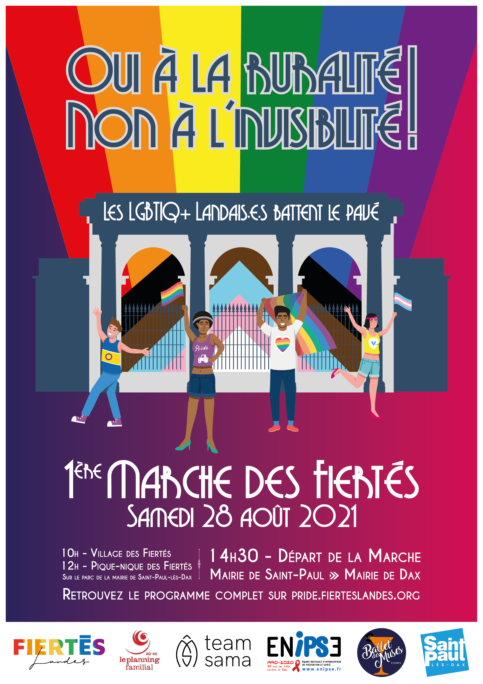"Fiertés Landes appelle toutes les organisations qui luttent pour une société plus juste, plus émancipatrice et contre toutes les formes de discriminations à défiler tou·te·s uni·e·s le samedi 28 août à 14h30, de la mairie de Saint-Paul-lès-Dax à la mairie de Dax pour démontrer que nos fiertés sont partout, sur tout le territoire et qu’elles ne s’arrêtent pas aux métropoles. La ruralité aussi est fière, elle le montre et continuera de le montrer, et ensemble, nous le crierons haut et fort !"